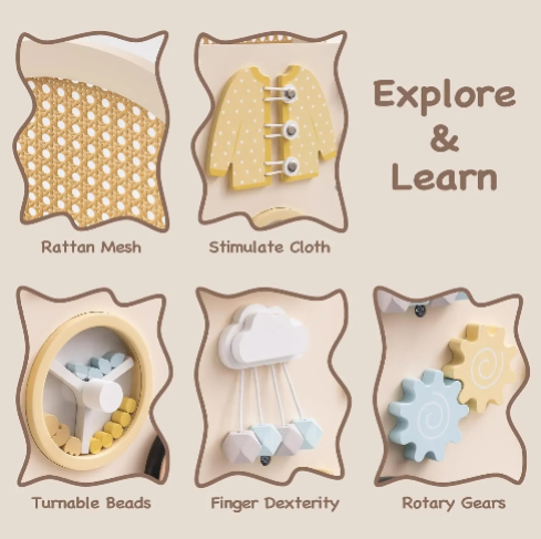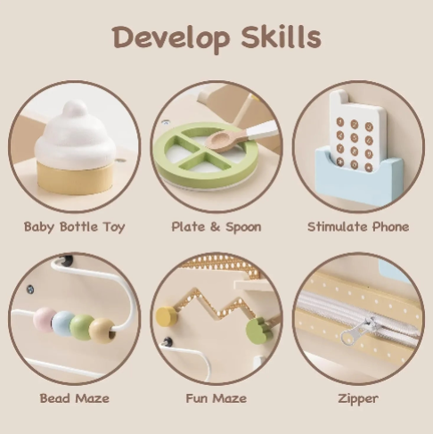 - Develops fine motor skills with cogs, bead mazes, zippers and more.