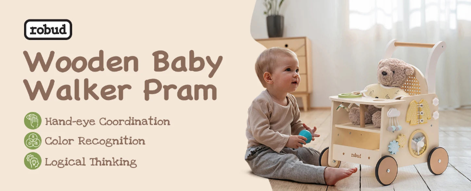 Give your little one a beautiful start to independent play with our Montessori wooden baby activity walker. Designed for ages 6 months plus, it supports early steps while encouraging hands on play through gentle, engaging activities whilst eventually supporting early confidence and balance, this sturdy push toy is filled with sensory elements that encourage curiosity, coordination and meaningful exploration.